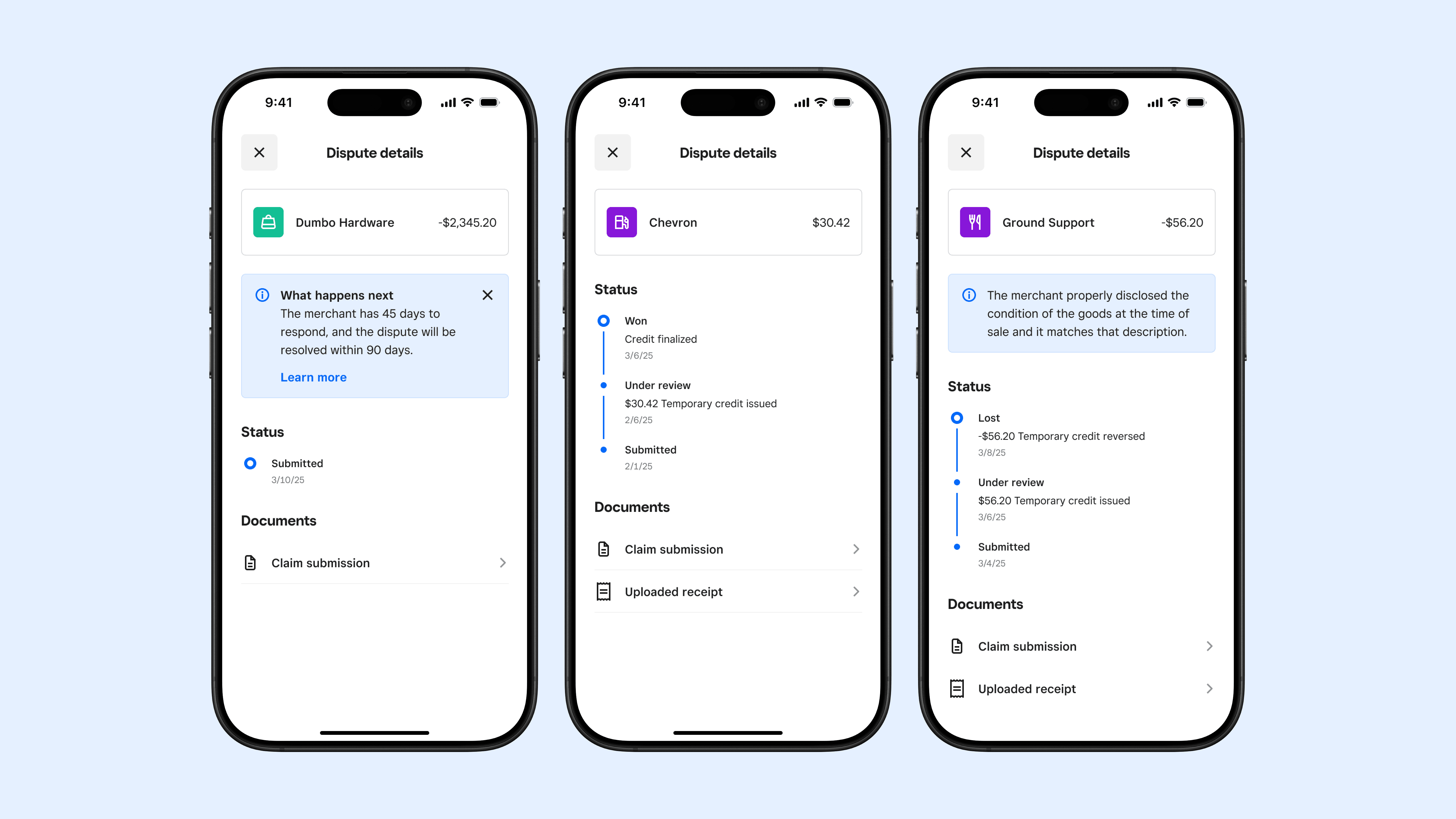 I redesigned the dispute details page with a focus on abstracting away unnecessary status complexity, presenting only contextually relevant information to sellers at each stage of the process. I also improved how sellers navigated to this page by introducing a direct link from the original transaction page and all relevant seller communications. This helped address a key pain point where sellers had difficulty finding their dispute status, leading to significant support volume.