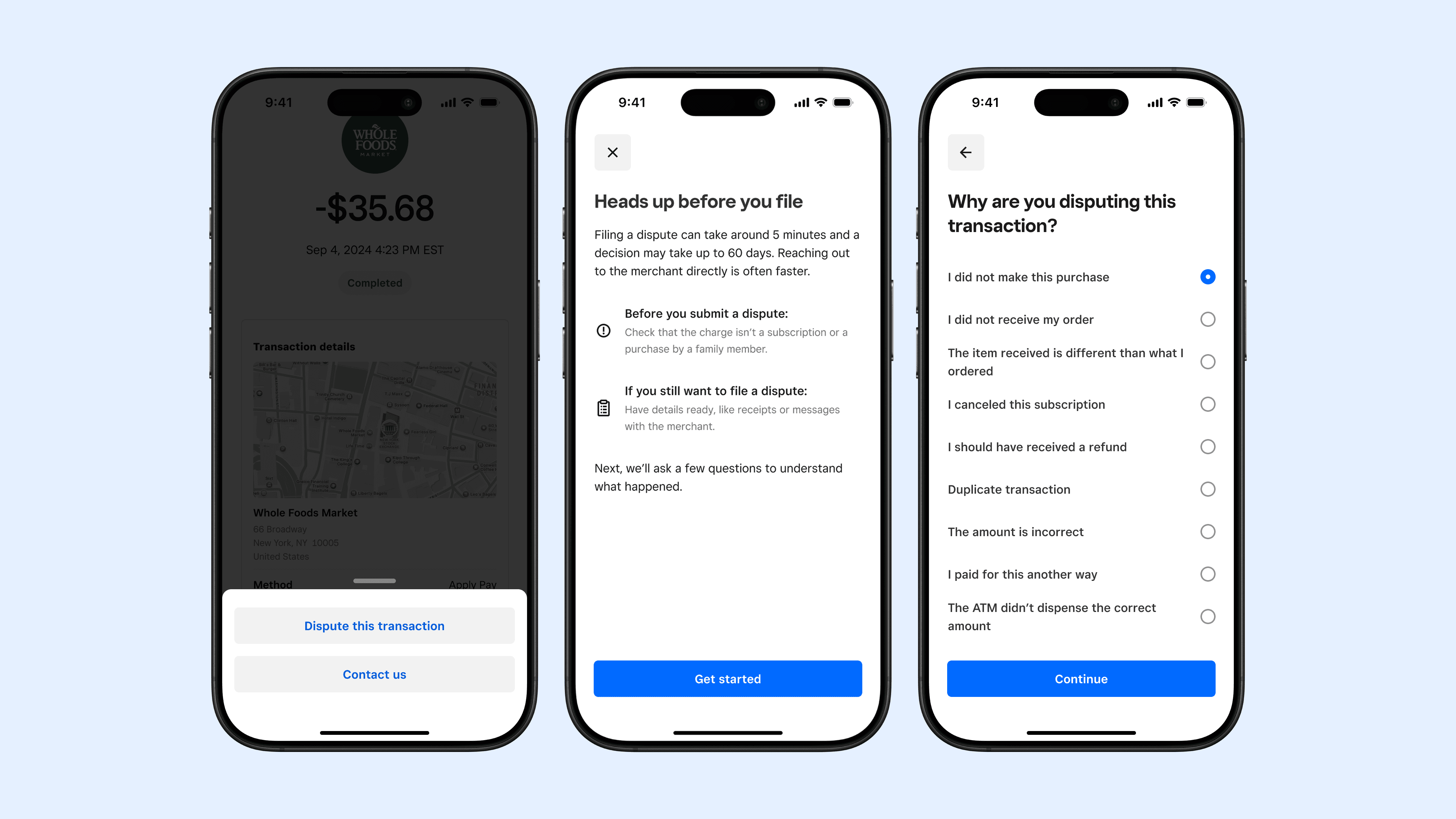 Square’s business debit card helps users with Square checking accounts tap into their money instantly and help them spend as soon as they make a sale. A key feature to help users feel safe and to ensure Square can protect their money is providing debit card holders the ability to dispute transactions that are fraudulent or that have other issues.