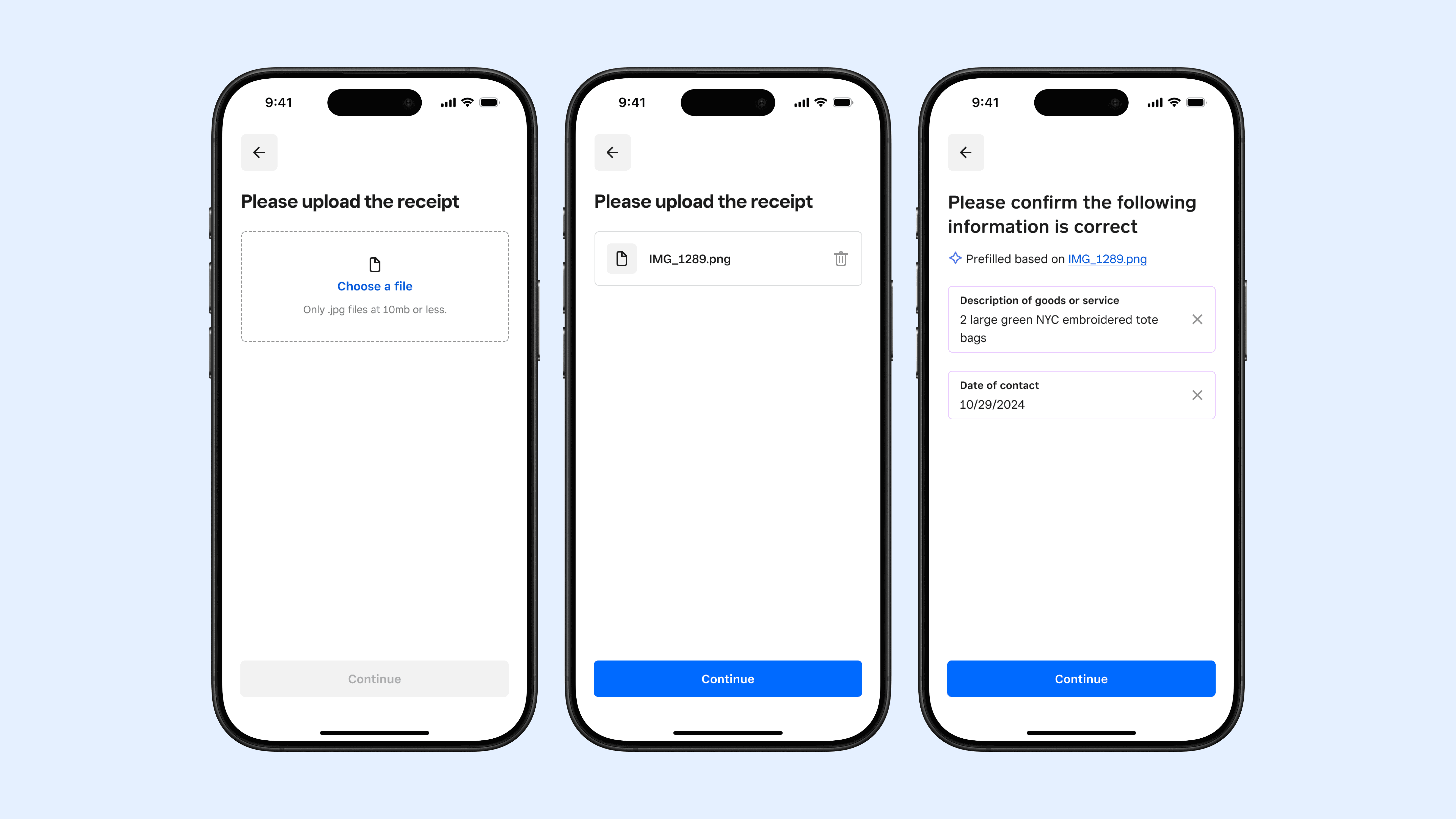 For questions requiring free form answers, we optimized the process by reducing the need for sellers to write anything manually. Instead, we pre-populate responses using information extracted from uploaded documents such as receipts earlier in the process and ask the seller to confirm that it looks right before continuing.